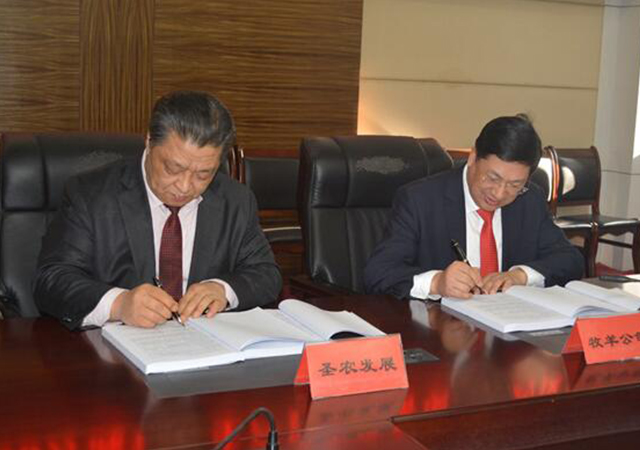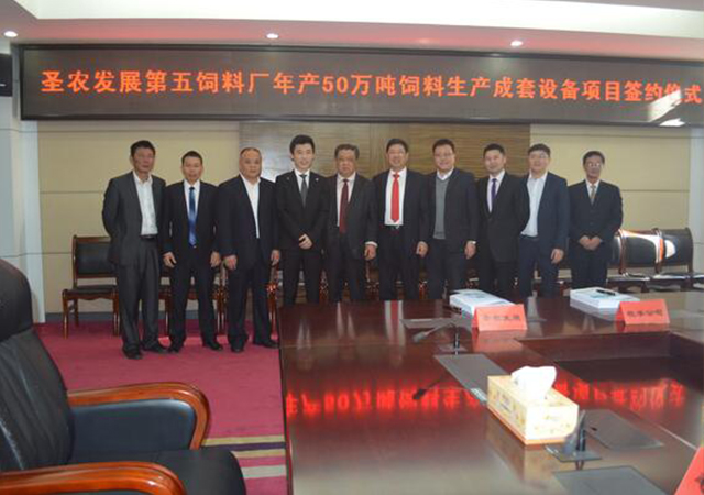 2016年12月10日,圣農(nóng)發(fā)展第五飼料廠年產(chǎn)50萬噸飼料生產(chǎn)成套設(shè)備項(xiàng)目簽約儀式在總部舉行。傅光明董事長同牧羊集團(tuán)范天銘總裁共同簽署了合作協(xié)議。