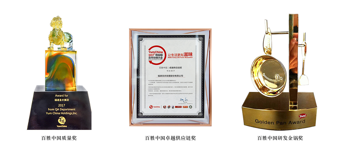 由于圣農(nóng)集團(tuán)在雞肉類新品開(kāi)發(fā)中表現(xiàn)的優(yōu)異成績(jī)和專業(yè)精神,百勝中國(guó)特授予“百勝中國(guó)研發(fā)金鍋獎(jiǎng)”。